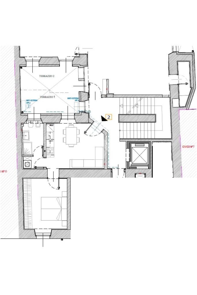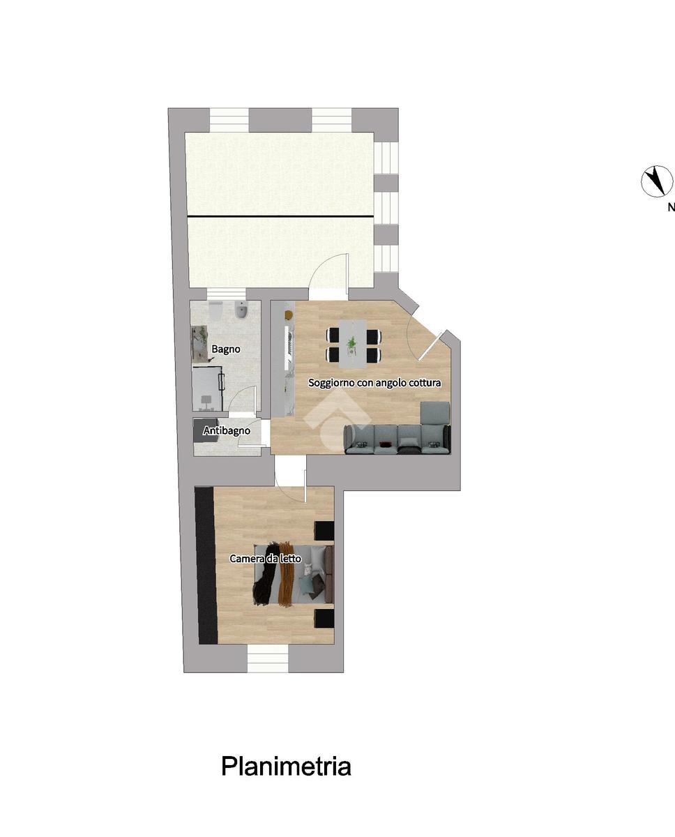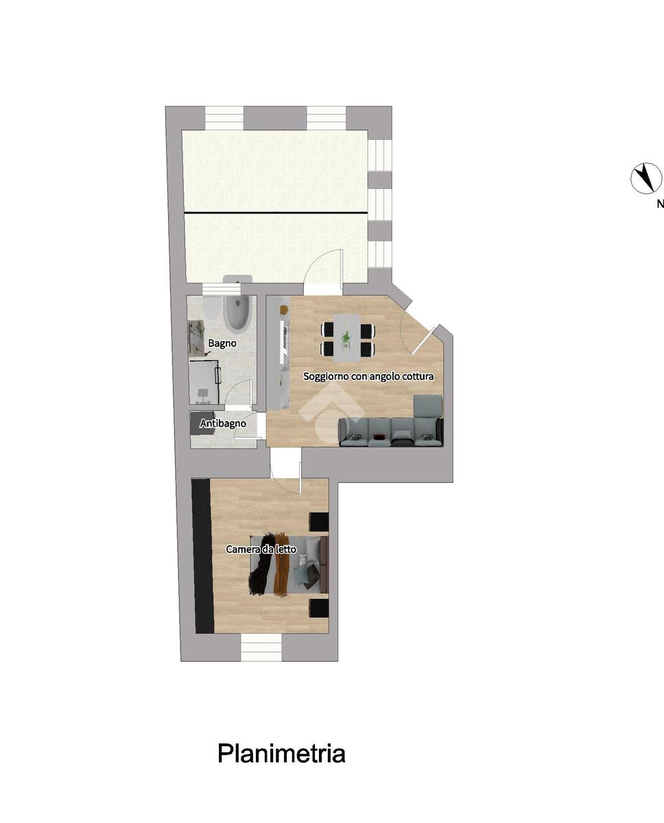 Al suo interno troviamo una zona giorno con angolo cottura e con accesso al terrazzino, il bagno completo con finestra e l'antibagno con attacco lavatrice e la camera matrimoniale.