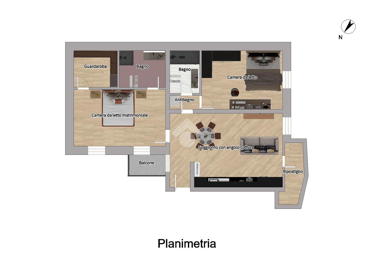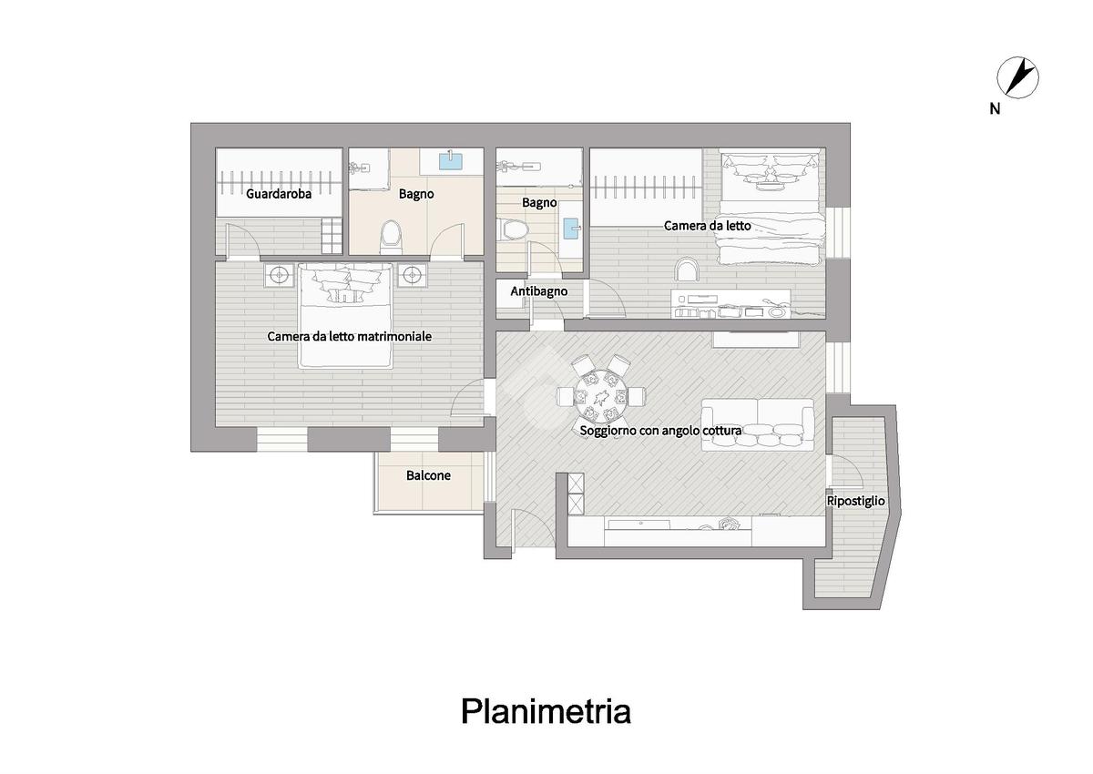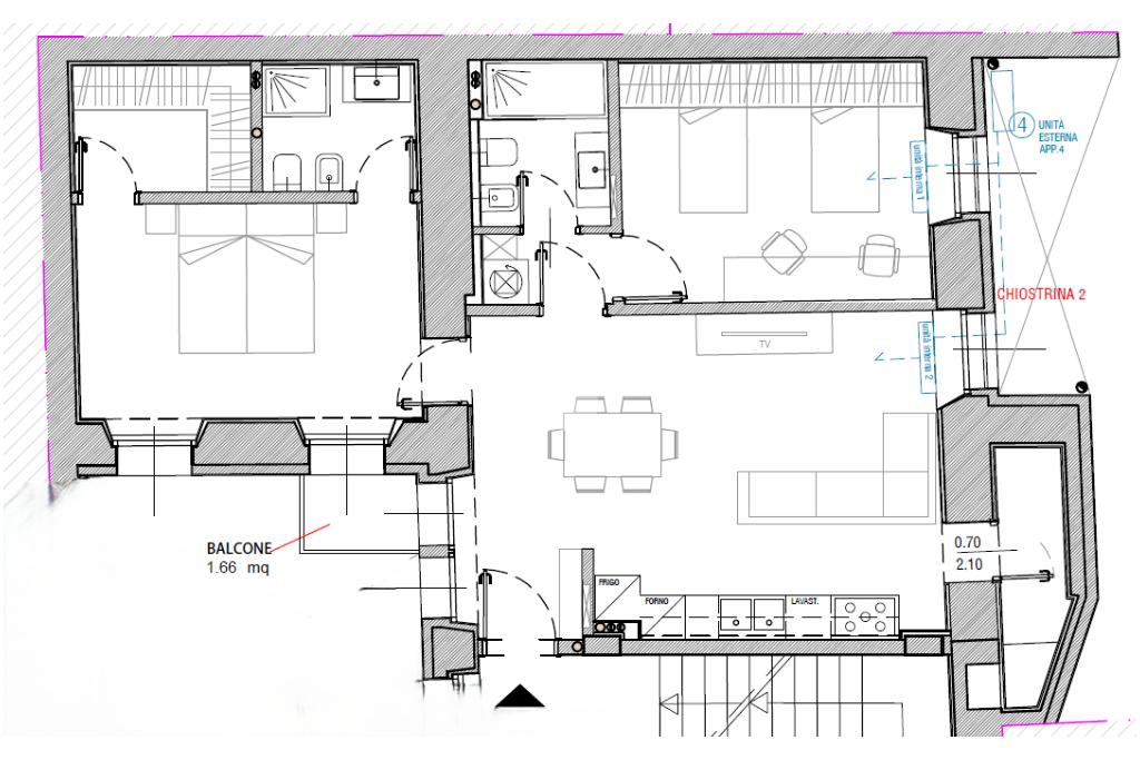 L'alloggio ha una spaziosa zona giorno con angolo cottura e con accesso al balcone. Questo ambiente ha inoltre una pratica dispensa nelle adiacenze dell'angolo cottura. La zona notte è composta da una camera matrimoniale con bagno privato e cabina armadio e una camera doppia dove nelle vicinanze è situato un bagno completo e un comodo attacco per la lavatrice.