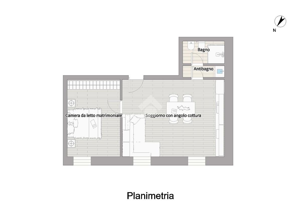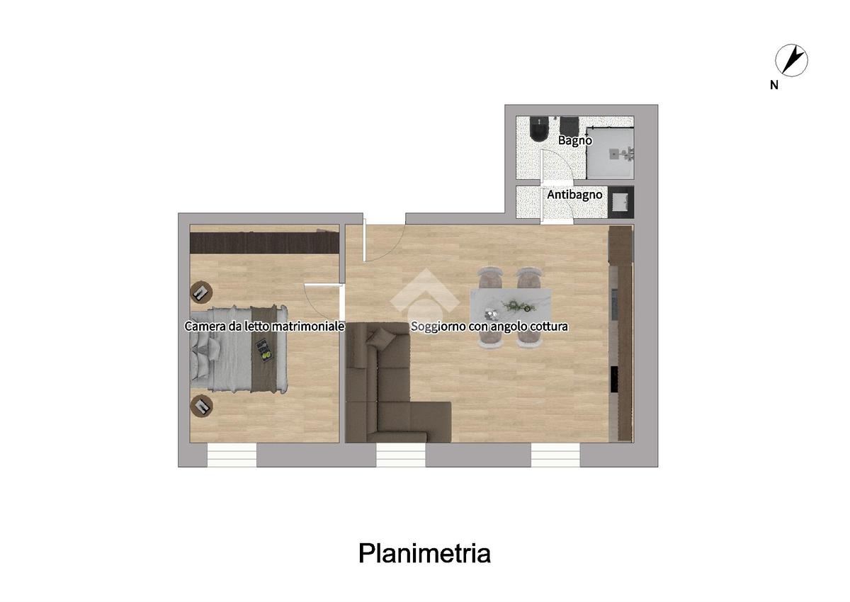Al suo interno troviamo una zona giorno con angolo cottura, il bagno completo con antibagno e la camera matrimoniale.